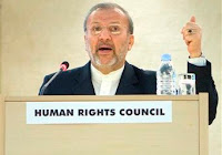 And which independent and enitrely fair-minded people are they placing the free world in the hands of? The Human Rights Council, an organisiation with a particular fetish about Israel. In this March 2, 2009 photo, Iranian Foreign Minister Manouchehr Mottaki is using the HRC as a platform to condemn the “illegitimate Zionist regime” and call for Israeli leaders to be indicted for crimes against humanity. Balanced.